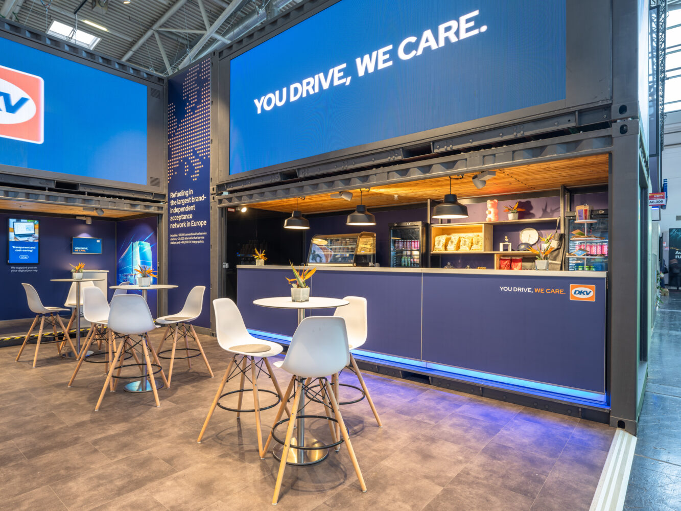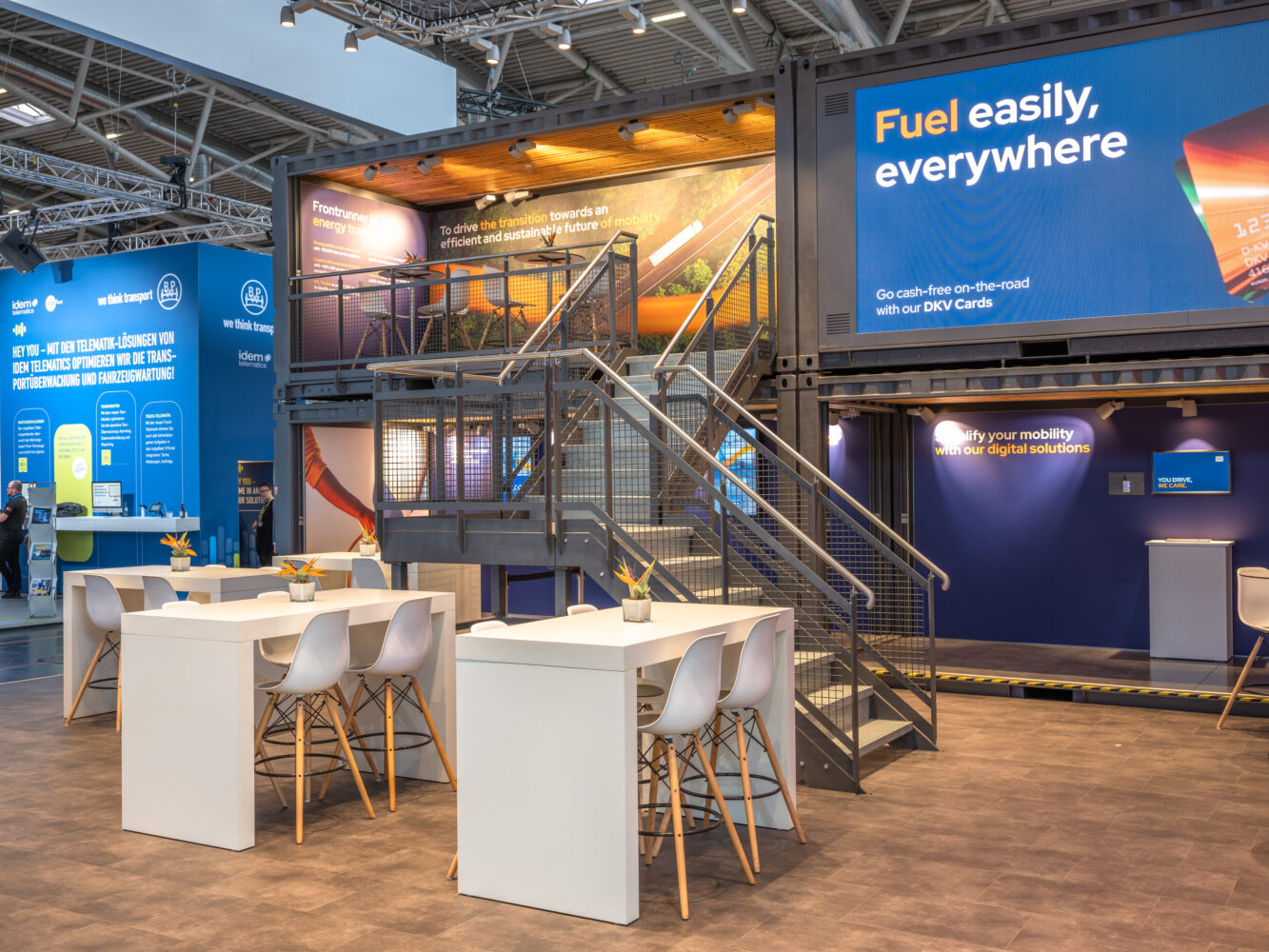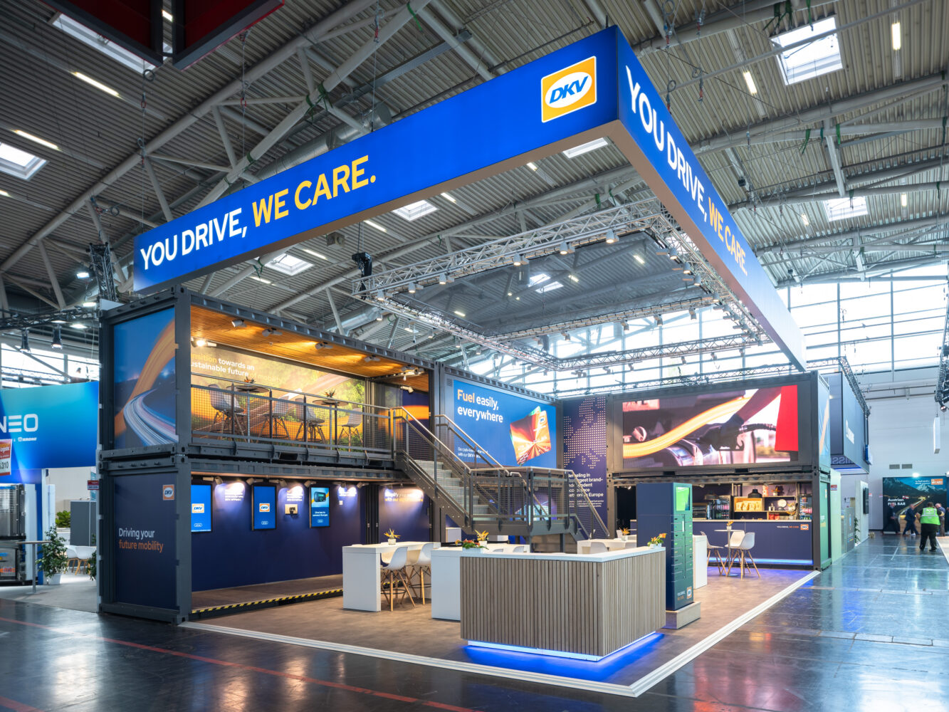 Das Konzept, Idee und Projektmanagement für dieses nachhaltige Messekonzept stammt von der Agentur DAS SCHWARZE SCHAF®. Durch die Umgestaltung von Schiffscontainern entstand ein einzigartiger Messestand auf zwei Etagen. Dies ermöglichte nicht nur eine optimale Präsentation der DKV Mobility, sondern auch eine effiziente Raumnutzung.